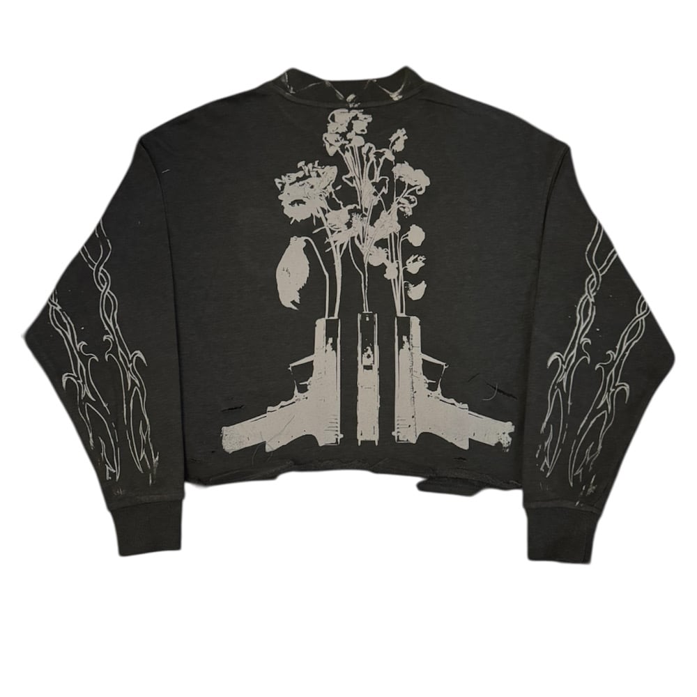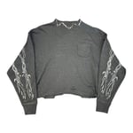 Thrifted crop top. Prints are all done with plastisol ink. Logos are made by Triponclothes LLC. Washed and quality tested.