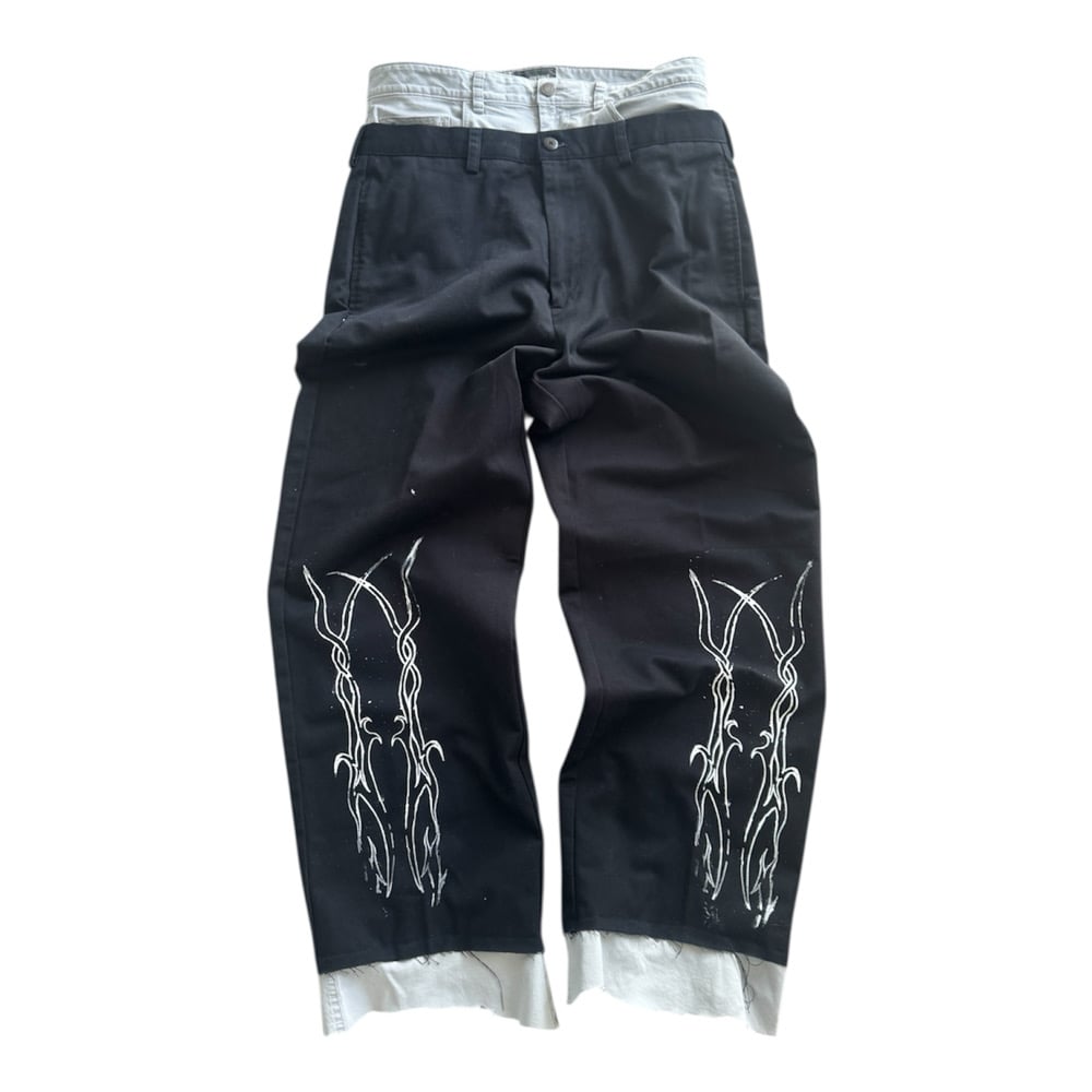 Double waisted pants, slight flair and extension on the bottom of the pant legs, waist is 32 inches, length is 41 inches.