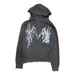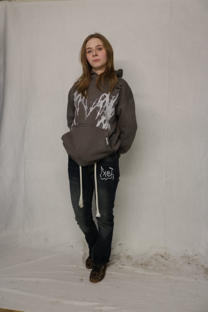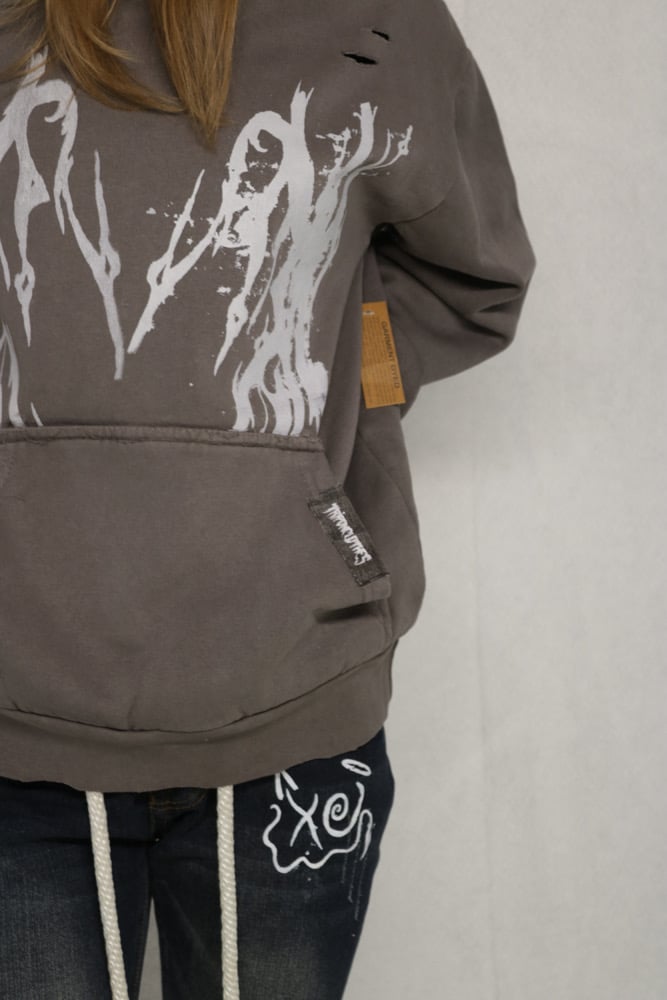Distressed hoodie, pocket is rehemed.